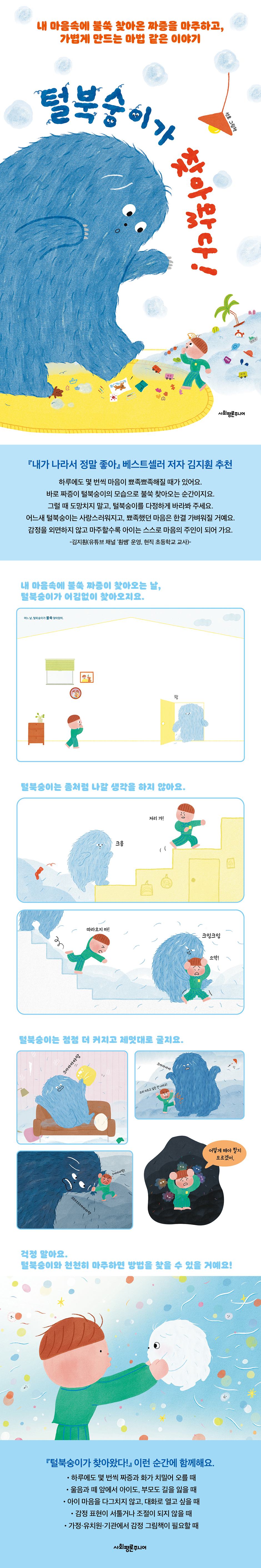 아이의 말 한마디에서 시작된 대화는 “무슨 일이 있었는지”를 천천히 꺼내게 하고, 그 순간의 마음을 함께 바라보게 합니다. 『털북숭이가 찾아왔다!』는 아이와 어른이 같이 언어로 마음 이야기를 시작하게 돕는 그림책입니다.